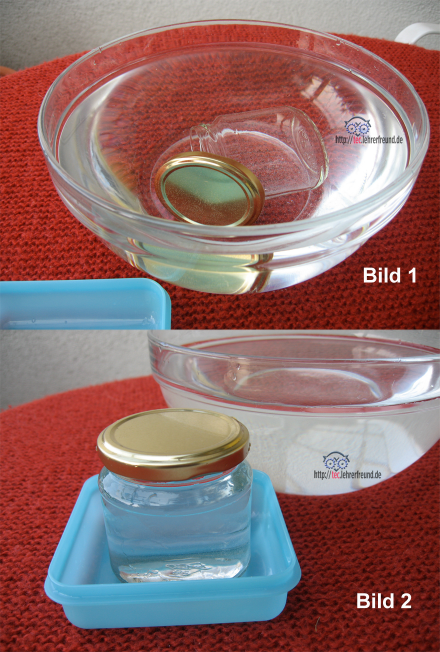 Bild 2: Wir tauchen das Marmeladeglas ganz ins Wasser ein und drehen den Deckel unter Wasser darauf, damit keine Luft mehr im Glas ist.