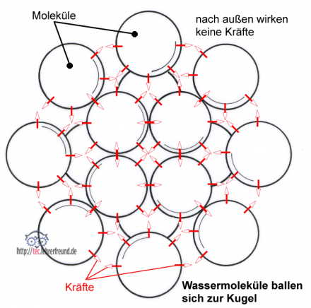 Dasselbe passiert bei einem frei herabfallenden Wassertropfen. Er bildet eine kugelige Form aus, weil alle äußeren Moleküle stark nach innen gezogen werden. Das Bestreben des Tropfens ist es, eine möglichst kleine Oberfläche zu bekommen. Eine Kugel besitzt gegenüber anderen geometrischen Formen die kleinste Oberfläche bei größtem Volumen.