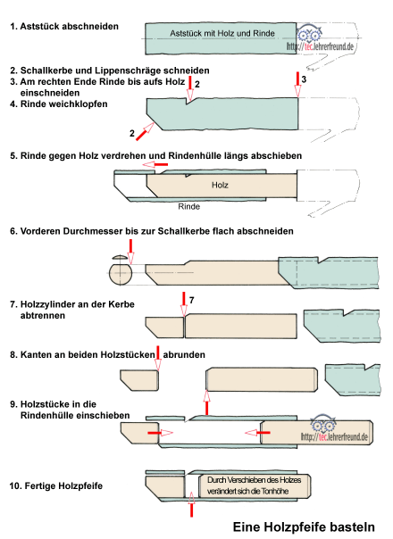 Die Weidenpfeife ist ein Instrument, das man leicht selbst herstellen kann. Mit einem scharfen Taschenmesser schneidet man ein geeignetes, etwa 2 cm dickes Aststück ab. tec.LEHRERFREUND-Skizzen zeigen, wie´s weitergeht.