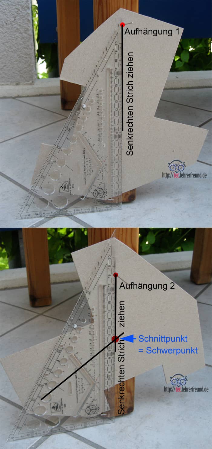 Im Schwerpunkt kann man sich die gesamte Masse des Pappteils vereinigt denken. Hängt man das Pappteil an der Aufhängung 1 auf, dann stellt sich das Teil so ein, dass der Schwerpunkt genau senkrecht unterhalb des Aufhängepunkts liegt. Das Gleiche ist bei Aufhängepunkt 2 (und bei jedem anderen Aufhängepunkt) der Fall.