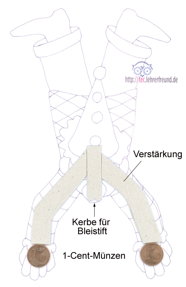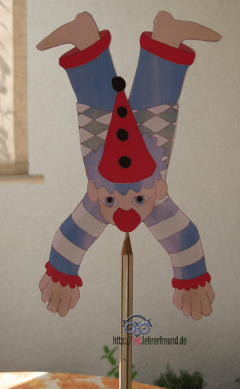Das erste Bild zeigt das Ergebnis Deiner Arbeit: Der Clown balanciert mit seiner Nase auf einer Bleistiftspitze. Sein nach unten verlegtes Hauptgewicht verdankt er zwei in den Händen versteckten Centstücken.