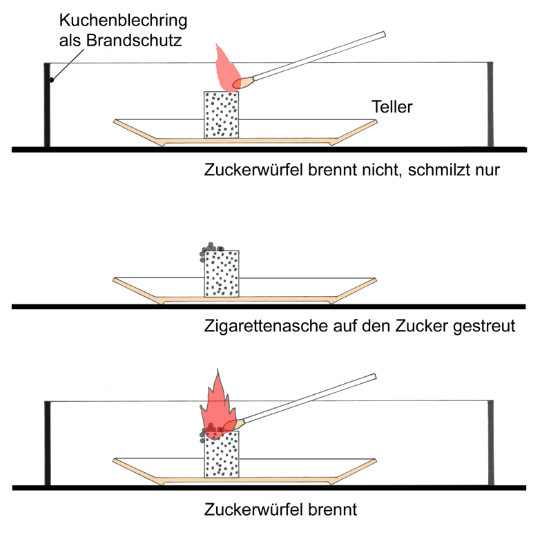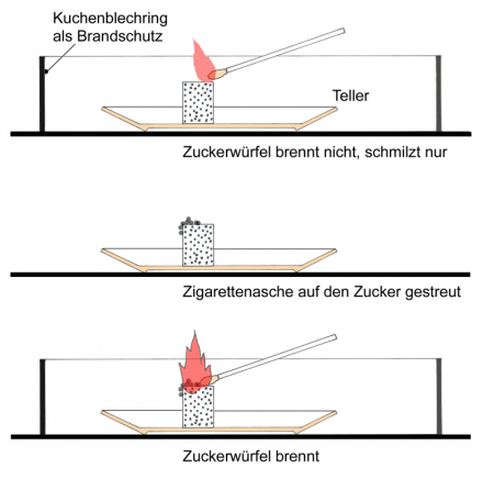 Streut man jedoch etwas Zigarettenasche auf das Zuckerstück und wiederholt den Brennversuch, dann ist die Überraschung groß: Das Zuckerstück beginnt plötzlich zu brennen.