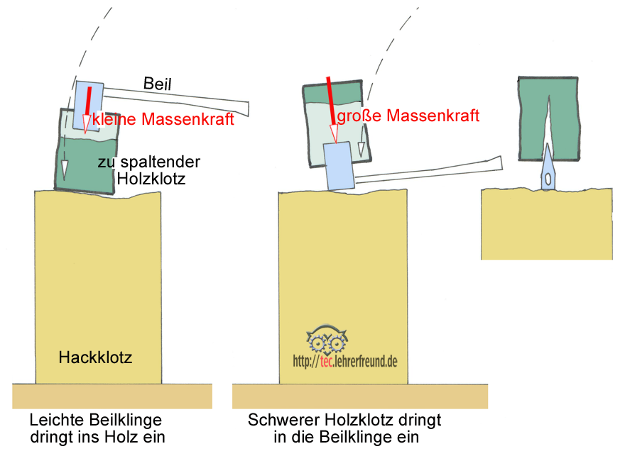 - Holzhacken: Ein Mann will einen Holzklotz spalten. Der Holzklotz hat eine doppelt so große Masse wie die Beilklinge. Mit welcher Methode hat der Mann mehr Erfolg? Begründung.