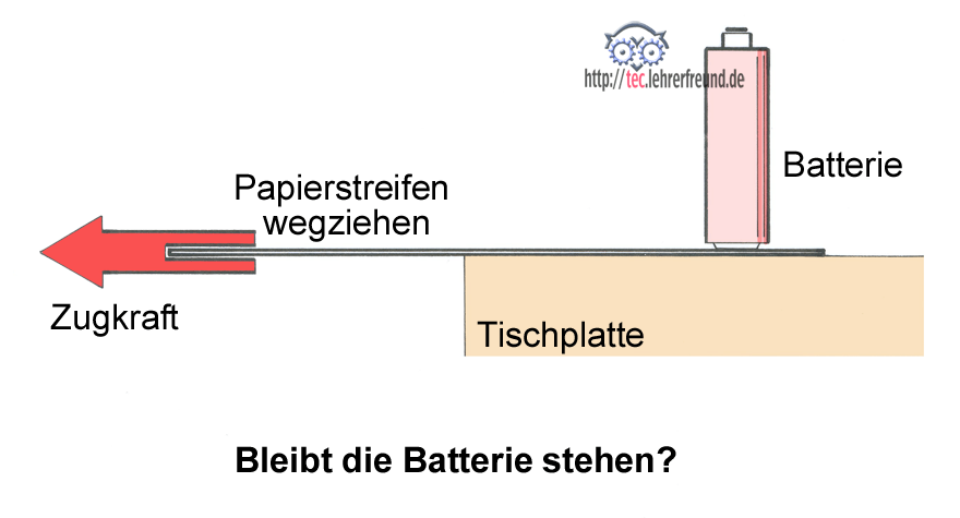 Es geht, wenn man den Papierstreifen mit hoher Geschwindigkeit nach links zieht. Dabei kann die Batterie mit ihrer Masse - und damit mit ihrer Trägheit - der Papiergeschwindigkeit nicht folgen: Sie bleibt stehen.