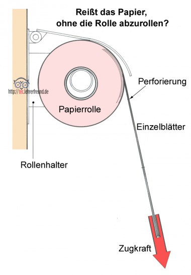 Die meisten Menschen nehmen wohl beide Hände zu Hilfe, wenn sie das benötigte Blatt bzw. die Blätter abreißen. Vielen Zeitgenossen ist dies aber zu umständlich: Sie machen es mit einer Hand. Dabei nützen sie instinktiv die Massenträgheit der Papierrolle aus: Beim schlagartigen Herunterziehen des Blatts bleibt die Rolle mit ihrer Masse zurück, so dass das Blatt an der Perforierung reißen muss.