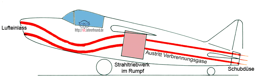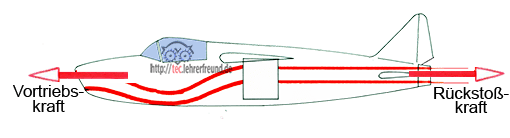Nach dem physikalischen Gesetz von der Impulserhaltung ergeben Gasmasse pro Sekunde kg/s mal Gasaustrittsgeschwindigkeit m/s die nach hinten gerichtete Kraft dieses Gasstrahls, als Formel: F = m・a [kg/s・ m/s = kg・m/s2 = N]. Auf das Flugzeug wirkt eine gleich große nach vorn gerichtete Kraft und verleiht ihm eine höhere Geschwindigkeit als sie bei mit Kolbenmotoren angetriebenen Flugzeugen möglich ist.