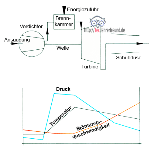 Im Prinzip finden auch im Strahltriebwerk die 4 Takte des Verbrennungsmotors statt. Während beim Kolbenmotor die Takte Ansaugen, Verdichten, Zünden+Arbeiten, Ausschieben in ein und demselben Zylinder nacheinander ablaufen, und zwar so, dass erst ein Takt beendet werden muss bevor der nächste beginnt, durchströmt im Strahltriebwerk die angesaugte Luft und der zugemischte Treibstoff die Antriebsmaschine fortlaufend ohne Pausen.