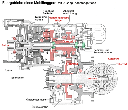 Aufbau und Funktionen des hier abgebildeten Getriebes sind im tec.LEHRERFREUND-Beitrag »Planetengetriebe (2)« beschrieben. Das Getriebe ist in einen Mobilbagger der Firma Zeppelin eingebaut.