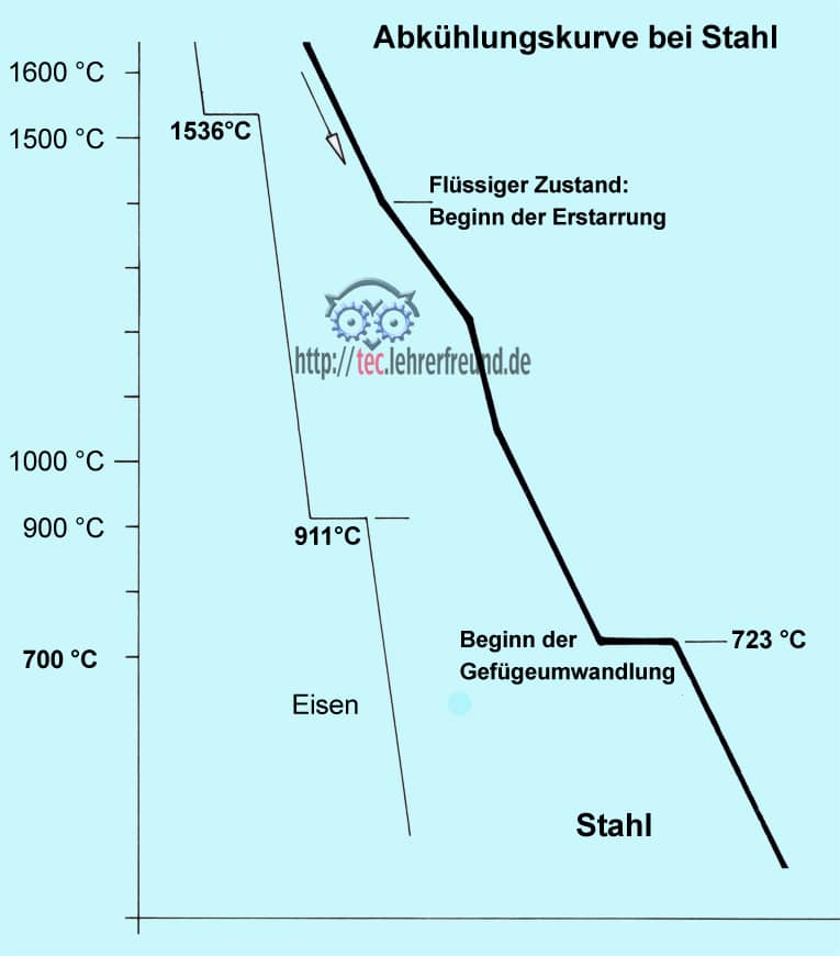 Kühlt man flüssigen Stahl ab, dann findet man wie bei Eisen Haltepunkte, die aber wegen des Kohlenstoffs nach unten verschoben sind. Je mehr Kohlenstoff ein Stahl enthält, desto weiter wandern die Punkte nach unten. So rutscht der bei Eisen beschriebene 911 °C-Punkt bei Stahl auf 723 °C ab. Auch der Schmelzpunkt wird durch den zunehmenden C-Gehalt verringert. Der Kohlenstoff bewirkt auch, dass die Umwandlungsvorgänge sich teilweise nicht mehr bei scharf begrenzten Temperaturen abspielen. Dieses Phänomen gibt es in ähnlicher Weise bei den Kraftstoffen Benzin und Dieselkraftstoff, die ebenfalls Mischungen (aus verschiedenen Kohlenwasserstoffen) sind.