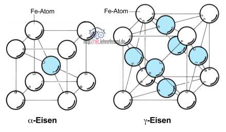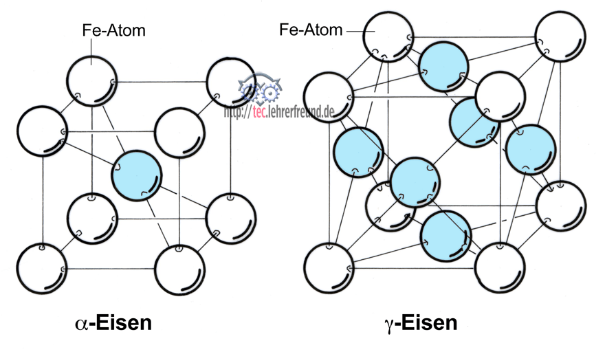 In einem Stück Eisen von Raumtemperatur bilden die Atome unzählig viele Würfel. Wie man im linken Bild (α-Eisen) erkennt, sitzen die Atome an den Würfelecken und in der Würfelmitte. Jeder Würfel besteht demnach aus 9 Atomen. Die Metallurgen haben dem Gebilde einen komplizierten Namen gegeben: Kubisch-raumzentriertes Eisen (Kubus = Würfel; zentriert = in der Mitte befindlich). Ein anderer, einfacherer Name dafür ist α-Eisen = alpha-Eisen. Erwärmt man dieses Eisen, dann findet bei 911 °C, also bei Rotglut, ein Gefügeumbau statt. Die Würfel lösen sich auf und formieren sich neu. Es entstehen Würfel, wie sie im rechten Bild dargestellt sind: Außer den Eckenatomen haben sie noch ein Atom in jeder Fläche. Jetzt sprechen wir von einem kubisch-flächenzentrierten Eisen oder γ -Eisen. Ein γ-Eisen-Würfel besteht aus 14 Atomen. Der Haltepunkt bei 911 °C lässt sich so erklären: Um α-Eisen in γ -Eisen umzuformen, wird Wärmeenergie verbraucht. Erst wenn dieser Umwandlungsvorgang abgeschlossen ist, bewirkt die Energiezufuhr eine weitere Temperatursteigerung. Die beiden Würfel besitzen unterschiedliche Kantenlängen.