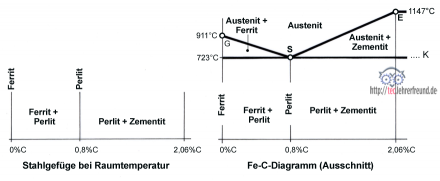 Um das beschriebene Geschehen übersichtlich darzustellen, hat die Metallurgie-Forschung ein spezielles Diagramm entwickelt: das Eisen-Kohlenstoff-Schaubild. Mit seiner Hilfe lässt sich ermitteln, in welchem Zustand sich ein unlegierter Stahl mit bekanntem Kohlenstoffgehalt bei einer bestimmten Temperatur befindet, und welche Gefügeveränderungen bei Temperaturänderungen zu erwarten sind.