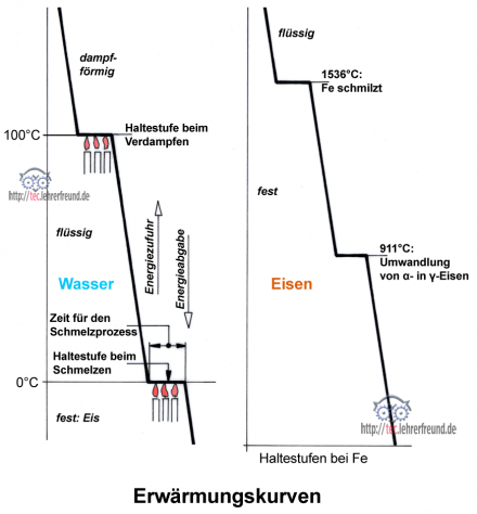 Bei 0 °C beginnt der Eisbrocken zu schmelzen. Es dauert einige Zeit, bis alles Eis geschmolzen ist. Während dieser Zeit bleiben das Eis und das Schmelzwasser trotz konstanter Wärmezufuhr auf 0 °C stehen. Erst wenn alles Eis geschmolzen ist, erwärmt sich das Wasser weiter. Offensichtlich verbraucht Eis von 0 °C also Energie, um zu Wasser von 0 °C zu werden.