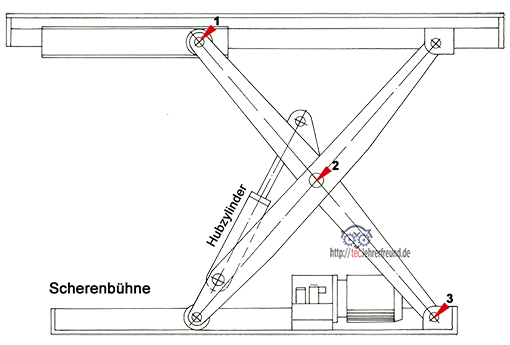 Scherenbühne: 1 = Achse; 2 = Achse; 3 = Achse