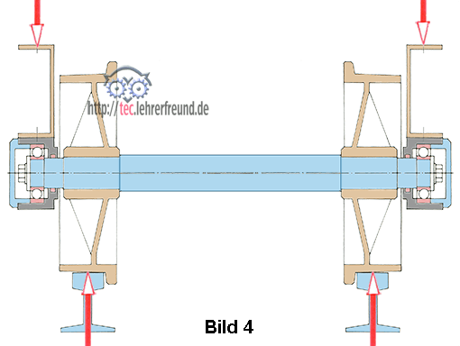 Die Umlenkrolle sitzt auf einer Achse (Bild 2), die sich drehenden Generatorbauteile sitzen auf einer Welle (Bild 3). Beide Zeichnungen sind vereinfacht dargestellt.