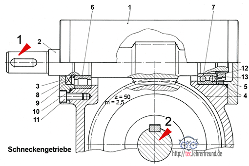 Schneckengetriebe: 1 = Welle; 2 = Welle