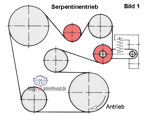 In Bild 1 ist der Antrieb der Nebenaggregate eines Pkws dargestellt, und wir wissen, dass der Antrieb von der Kurbelwelle ausgeht. Von dort läuft der Keilrippenriemen über die Antriebsscheiben von Wasserpumpe, Generator, Lenkhilfepumpe und Klimakompressor. Die kleinen roten Scheiben sind Umlenk- bzw. Spannrollen.