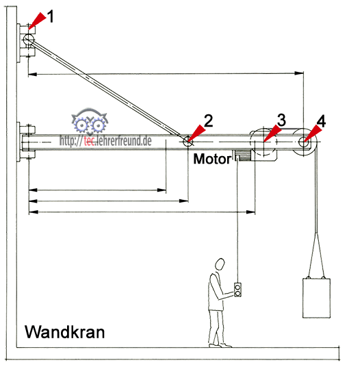 Wandkran: 1 = Achse; 2 = Achse; 3 = Welle; 4 = Achse