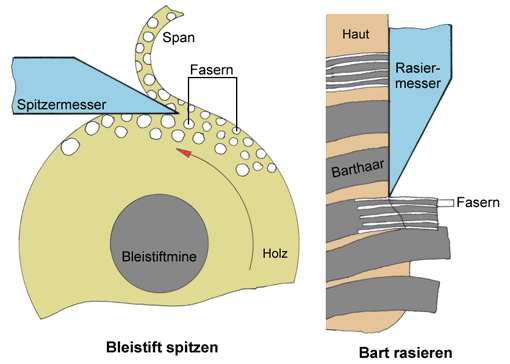 Die beiden Skizzen, in denen das Rasieren und das Bleistiftspitzen vergrößert dargestellt sind, zeigen jedenfalls dies: Das Spitzermesser schält parallel zu den Holzfasern, das Rasiermesser dagegen muss die Barthaare senkrecht zur Haarachse abscheren. Mit großer Wahrscheinlichkeit fällt dem Spitzermesser das Abheben der Fasern leichter.