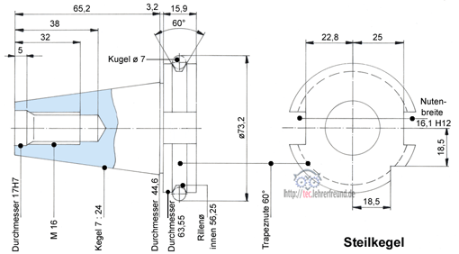 Halber Kegelwinkel: Kegelverhältnis C = 7 : 24 ––> Neigung C/2 = 7 : 48 = 0,1458