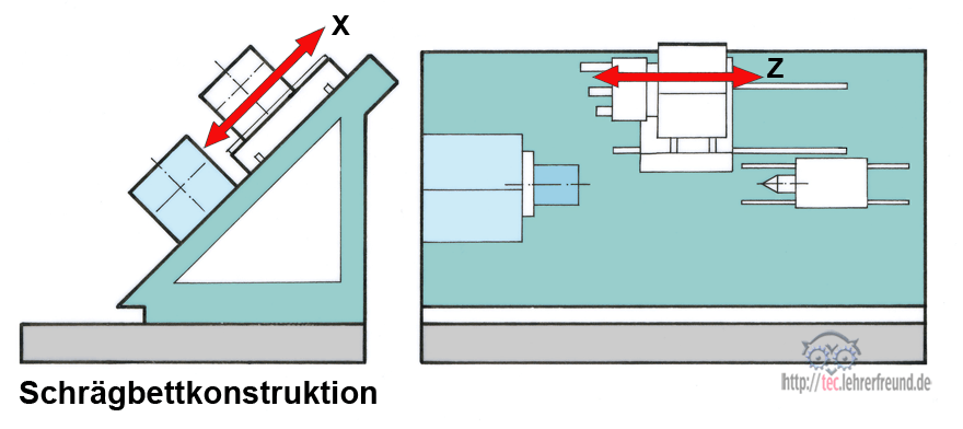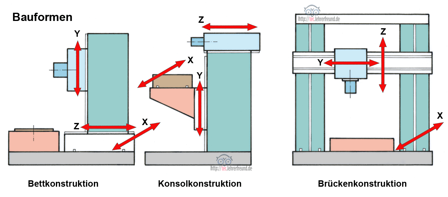 Die äußere Bauform einer Werkzeugmaschinen kann als Bettmaschine, als Konsolmaschine oder als Brückenmaschine ausgeführt sein. Eine besondere Bettform ist das Schrägbett. Diese Form wurde für die ganz oben dargestellte CNC-Universal-Drehmaschine gewählt.