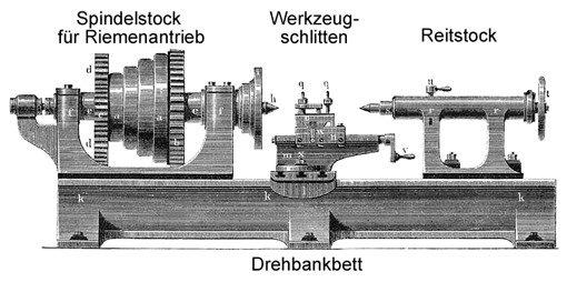 Bild: Drehbank um 1890. Der Werkzeugschlitten besitzt keinen Vorschubantrieb. (Bild WIKI, erweitert)