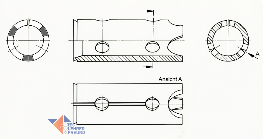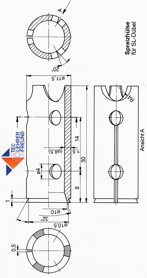 Anmerkung: Die Hülse wird aus einem Stanzteil, Blechdicke 1,5 mm, gefertigt. Die ebene Platte (Bild) wird über einen Dorn zum Zylinder gewalzt. Die Schlitze werden nach dem Walzen auf dem Dorn eingekerbt.