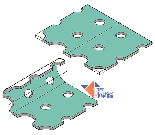 Die im Stanzteil kreisförmigen Formen werden beim Rundwalzen verzerrt. Zeichnen Sie sie vereinfacht als Kreise oder Radien. An einigen Stellen werden sich Ellipsen nicht umgehen lassen.