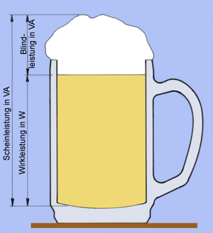 Der Vergleich mit einem Glas Bier, das eine (kaum Durst löschende) Schaumkrone überwallt, macht den Zusammenhang zwischen Wirkleistung, Scheinleistung und Blindleistung verständlich.