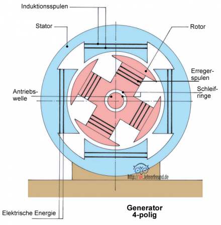 Der im feststehenden Statorgehäuse (= Ständer) gelagerte Rotor (= Läufer) wird z. B. von einem Verbrennungmotor angetrieben. Das vom Rotor mit einem Dauermagnet oder einem Elektromagnet (Feldspule oder Erregerwicklung) erzeugte, umlaufende magnetische Feld induziert in den Leiterwicklungen (Induktionsspulen) eine elektrische Spannung.
