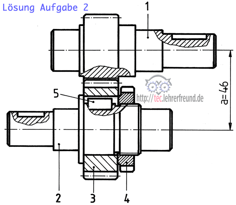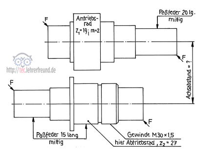 2. Im Bild sind im Entwurf unvollständig zwei Wellen dargestellt, die über zwei Zahnräder miteinander kämmen. Das Zahnrad der oberen Welle (Antriebswelle aus C 20) ist in einem Stück mit der Welle gefertigt. Zahnradgrößen: Modul m = 2 mm, Zähnezahl z1 = 19. Das Abtriebsrad sitzt auf der unteren Welle (aus St 60), wo es mit einer Nutmutter M 30 x 1,5 - DIN 1804 axial festgezogen wird. (Falls die Mutter in Ihrem Tabellenbuch nicht aufgeführt ist: Außendurchmesser 50 mm, Breite 10 mm). Gegen Verdrehung auf der Welle ist das Zahnrad mit einer Passfeder, Form A, gesichert. Das Abtriebsrad aus 31 CrMo 12 hat 27 Zähne und ist 20 mm breit.