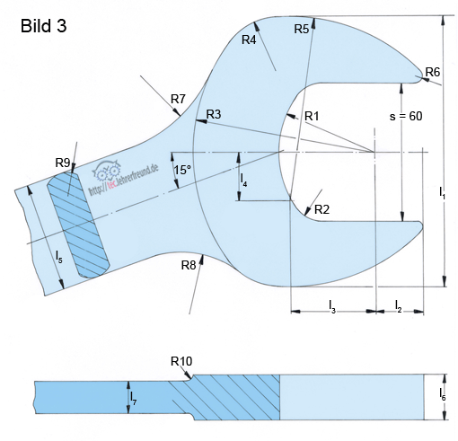 Bild 2 zeigt einen Maulschlüssel in Vorderansicht und Draufsicht im Schnitt. Der (nur mit Kopf und teilweisem Griff) dargestellte Schlüssel soll mit einer Schlüsselweite s = 60 mm gezeichnet werden. Die Aufgabe hat starke geometrische Bezüge. Damit ist insbesondere das Aneinanderreihen von unterschiedlichen Radien gemeint.