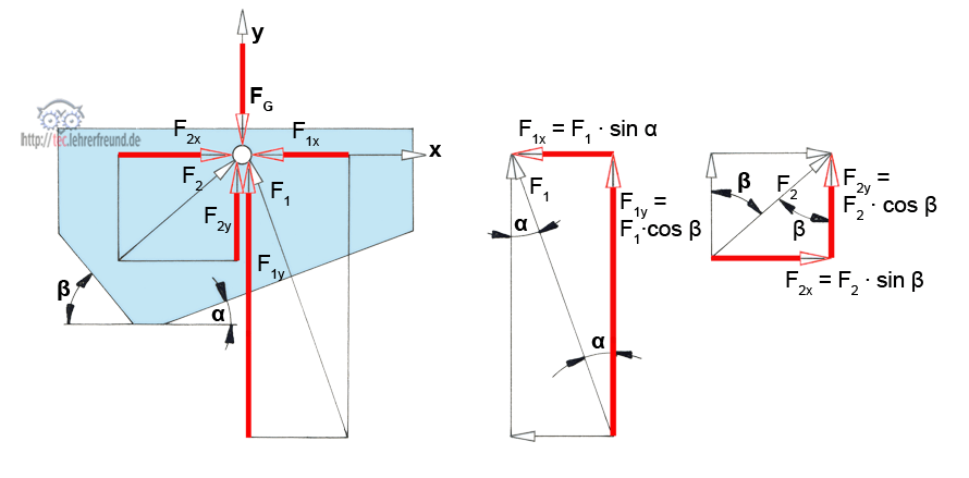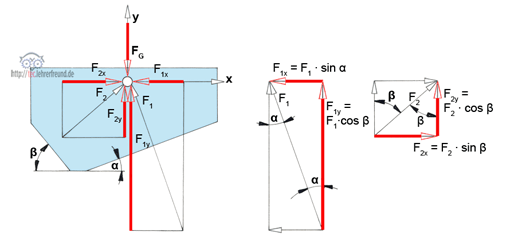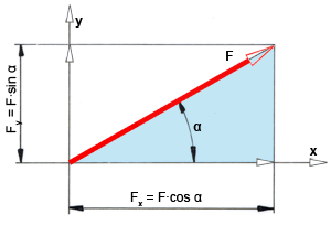 Allgemein gilt: Bei einer unter dem Winkel α geneigten Kraft F sind deren Komponenten