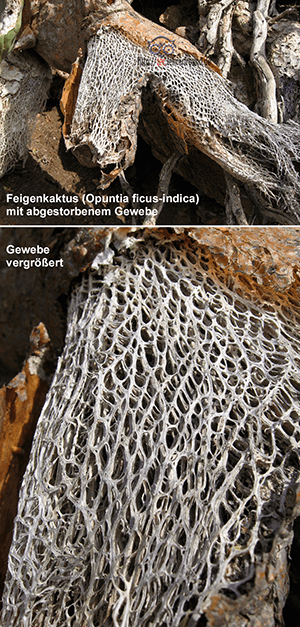 »Gräser wie der Schachtelhalm und Bambus gelten als Vorbilder der Natur für Leichtbaukonstruktionen. Sie besitzen hohle Stängel mit dünnen Außenwänden und bieten doch eine erstaunliche Stabilität, wenn sie Windkräften und anderen Belastungen ausgesetzt sind. Das Foto eines skelettierten Feigenkaktus mit ca. 8 cm Blattbreite zeigt die übrig gebliebene, verholzte Struktur. Man erkennt darauf das kunstvoll aufgebaute Fasergewebe, das auch dieser Pflanze eine hohe Biege- und Verdrehsteifigkeit bei geringem Gewicht verleiht.«