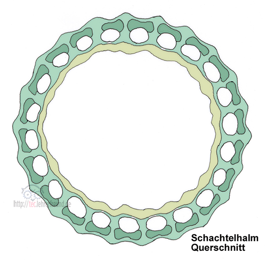 • Welchen Vorteil könnte es haben, dass – anders als im Schachtelhalm (Bild unten) – die Innenwandstruktur des Bananenstamms nicht konzentrisch verläuft, sondern in sichelförmigen Abschnitten?
